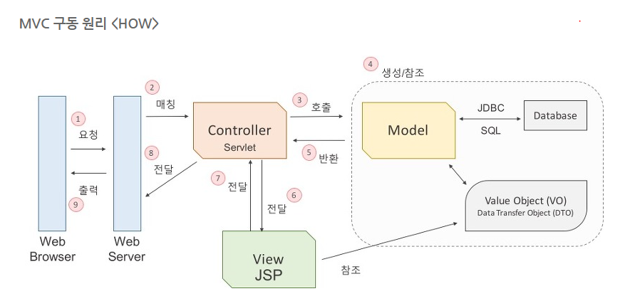 1. 웹 브라우저가 웹 서버에 웹 애플리케이션 실행을 요청한다. (MVC 구조가 WAS라고 보면된다.)