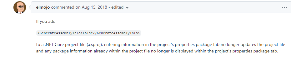 If you add <GenerateAssemblyInfo>false</GenerateAssemblyInfo> to a .NET Core project file (.csproj), entering information in the project's properties package tab no longer updates t...