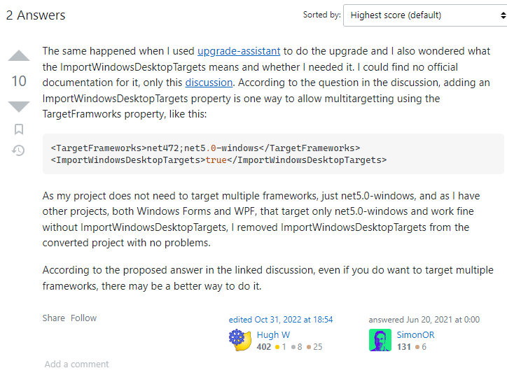 I have used the try-convert tool to convert my projects from .NET Framework to .NET 5.0 When inspecting the converted *.csproj files for projects that are targeting .net50-windows I noticed the el...